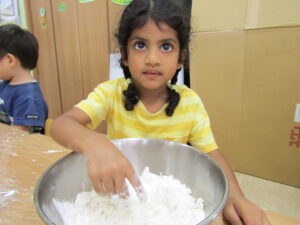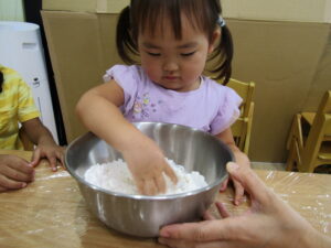 ボールにお団子の粉とお水を入れて混ぜたらみんなでこねこね・・・