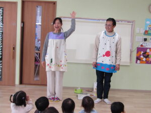 まずはお父さんとお母さんに、先生が付けている「エプロン」を来てもらいました