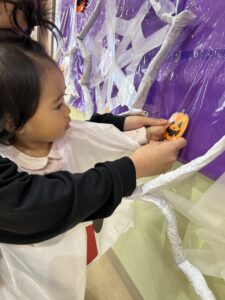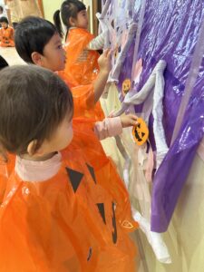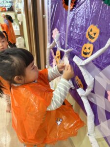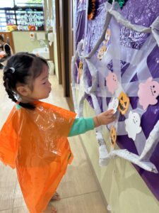 見つけたおばけやかぼちゃをクモの巣に貼っていきます。