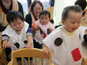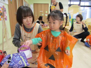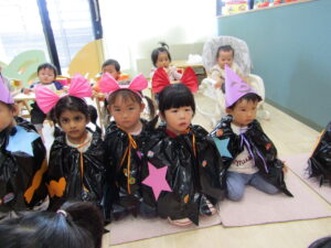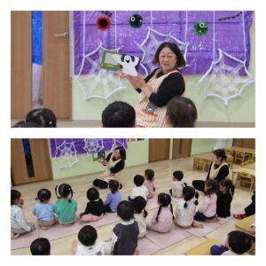 ハロウィンの絵本を読んでもらって期待に胸を膨らませる子どもたち