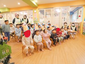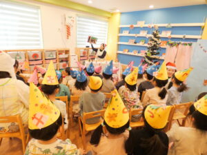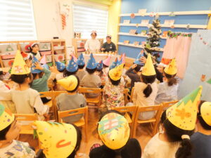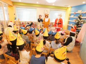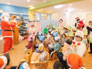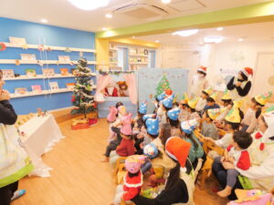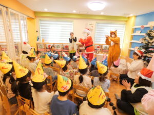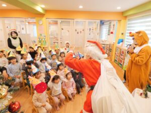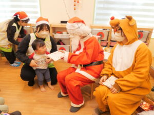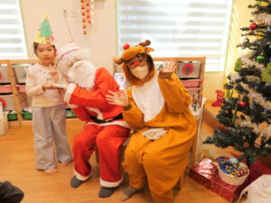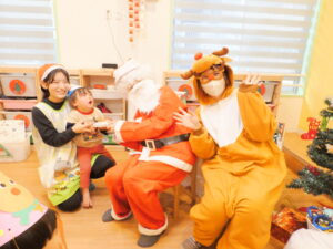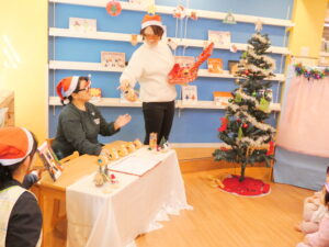 サンタ先生とトナカイ先生がプレゼントを持ってやってきました。