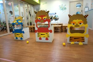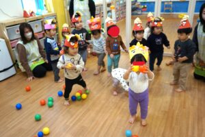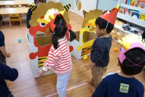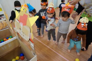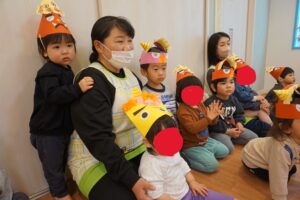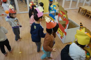 自分たちで作ったお面をかぶって、「おにはそとー」「ふくはうちー」と上手に鬼退治が出来ました!
