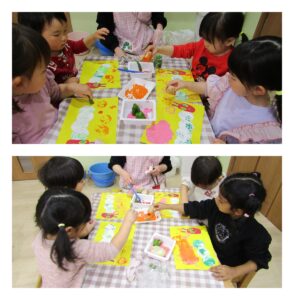 ぺんぎん組さんときりん組さんは、野菜スタンプをしました![]()