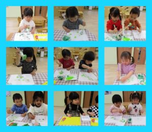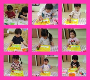 野菜の形を見ながら、スタンプを押して綺麗に形が出来ると、「できた!」とキラキラの笑顔で見せてくれました![]()