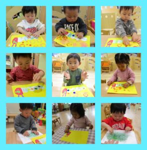 ひよこ組さんは、あおむしの目と体の上にシールを貼りました。