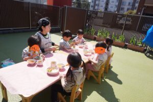 お話し上手な1歳児クラスのみんな。給食もチューリップと一緒に食べました