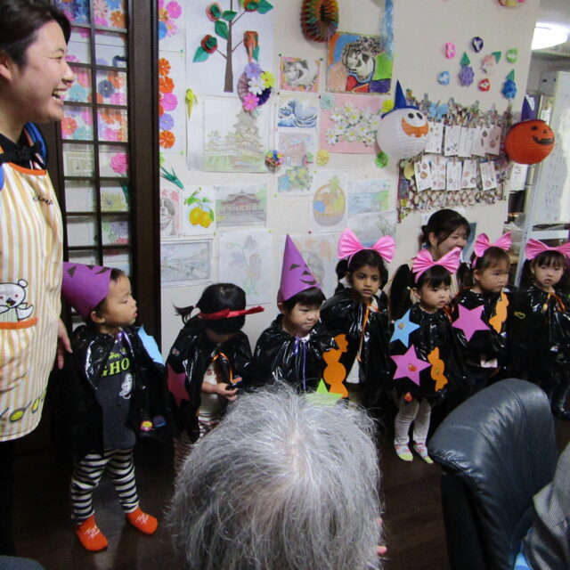 こんにちは! てぃだまちキッズ新検見川駅前です。 今回はハロウィンパーティーの番外編! 2歳のきりんぐみさんが、地域交流の一環として介護施設を訪問した様子をお伝えします。 おじいちゃんおばあちゃんの前で披露する「どんぐりころころ」を今日まで毎日みんなの前で練習してきました ドキドキしながらおじいちゃんおばあちゃんのいる施設に向かいます。 施設の方々に歓迎されて緊張する子どもたち。 それでも上手に「どんぐりころころ」を歌っていました🎵 最後はおじいちゃんおばあちゃんから折り紙のプレゼントをもらって嬉しそうにしていたてぃだキッズ達です 盛沢山だったハロウィンの1日 楽しかったね